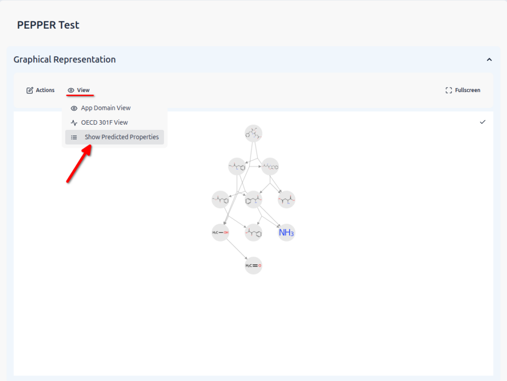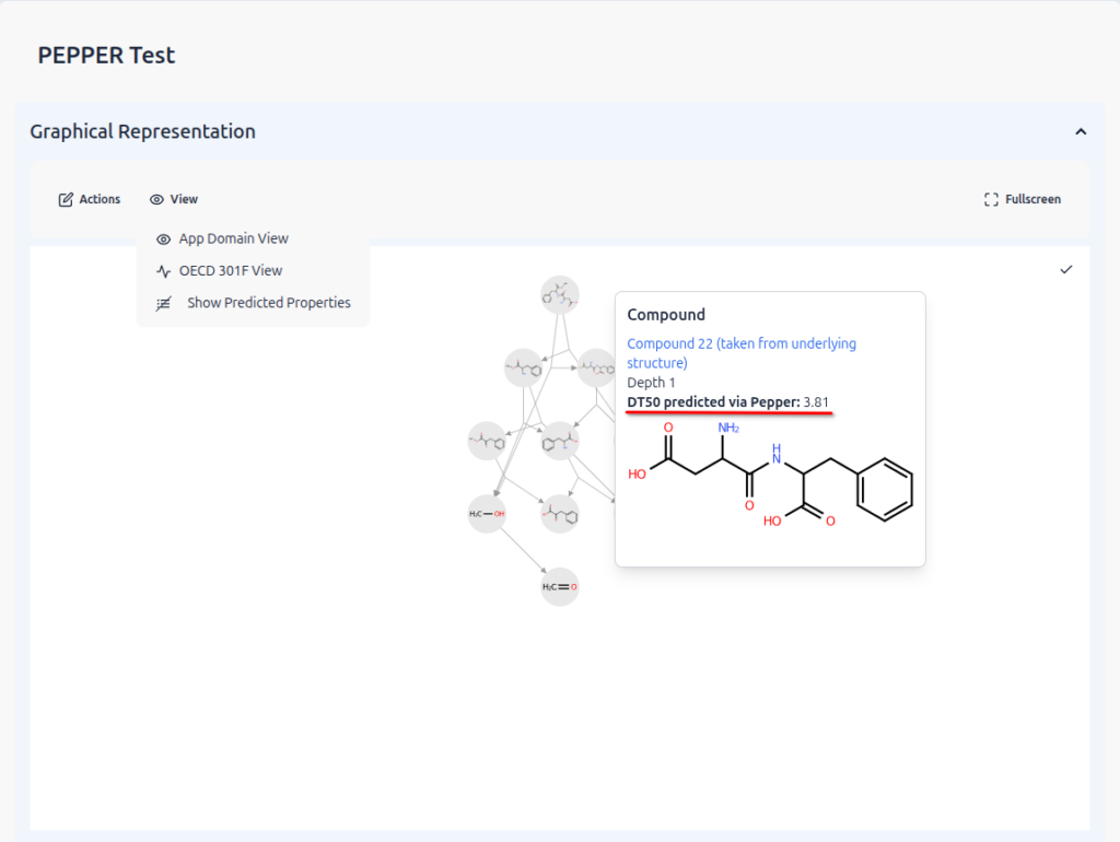 The half‑life prediction is fully integrated into the enviPath pathway workflow. When a pathway prediction is performed using the appropriate predictor, DT50 values are calculated automatically and displayed directly within the pathway visualization. Predicted half‑lives can be explored interactively by enabling predicted properties and hovering over individual pathway nodes, allowing users to quickly assess persistence across entire transformation cascades.